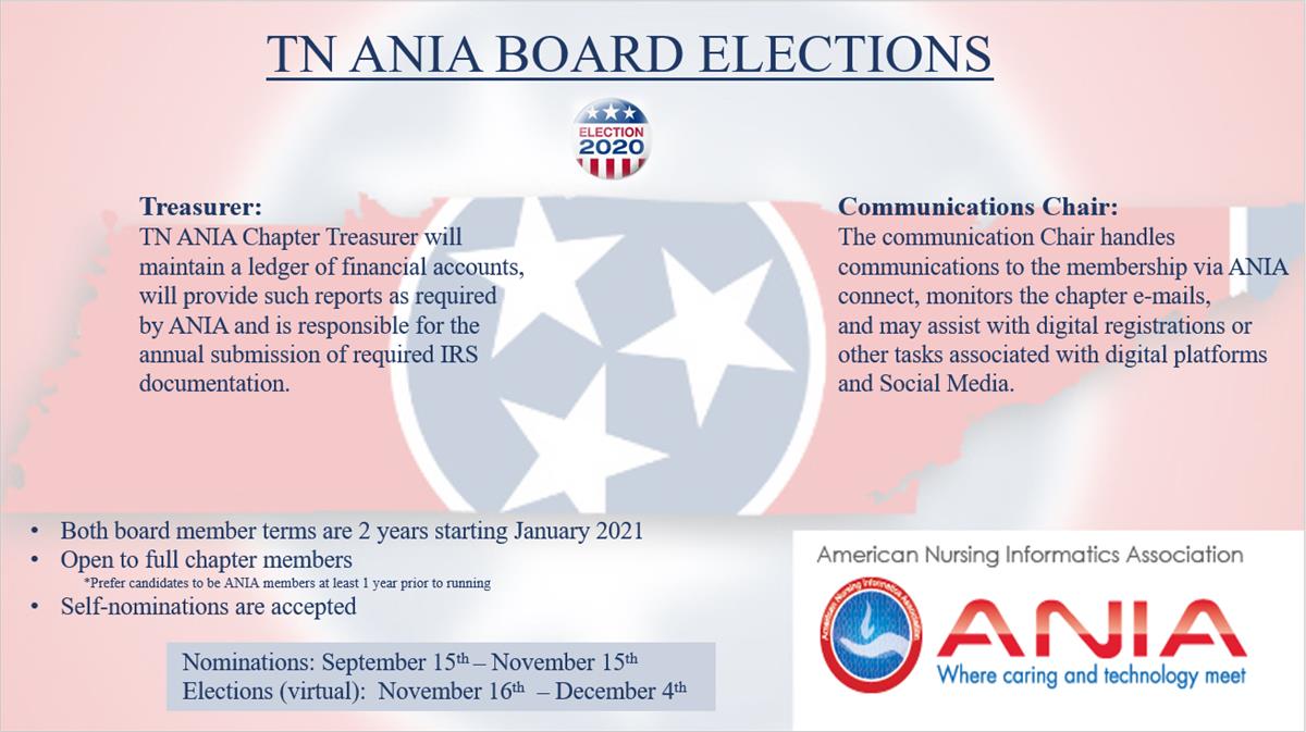 Please submit your nominations for Treasurer and Communications Chair to: aniaoftennessee@yahoo.com