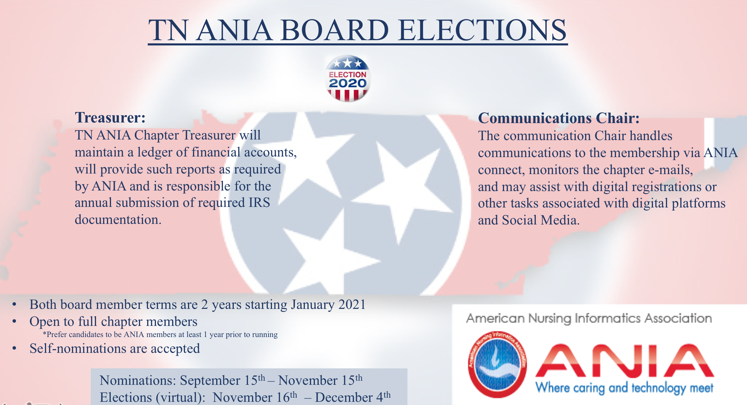 The deadline to submit nominations for TN Chapter Treasurer and Communications Chair is quickly approaching. To date, there has been a minimal response, and we everyone to help ensure that we have a successful election. Please submit your nomination for Treasurer or Communication Chair as soon as possible. The nomination period ends on November 15th, and voting will begin on November 16th. If you think a fellow member, or yourself, would be a good fit for either of these positions, please submit your nominations via email to aniaoftennessee@gmail.com
