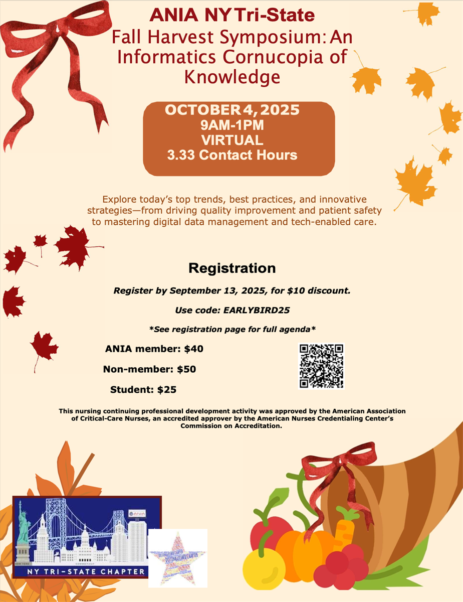Registration is now open for ANIA NY Tri-State Chapter: Fall Harvest Symposium: An Informatics Cornucopia of Knowledge. Great opportunity to hear speakers committed to advancing health data systems, clinical innovation, scholarship and professional development. You won't want to miss this!